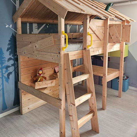 Rutchebane kan medfølge, den passer til ‘hullet’ for enden af sengen. Gives væk pga. klistermærkerne, som dog kan fjernes, samt fordi et af brædderne er knækket, som det ses på billedet. Det er repareret og udgør ikke et problem ift madras.