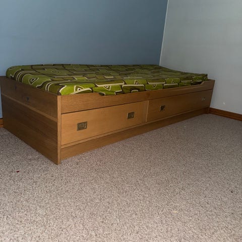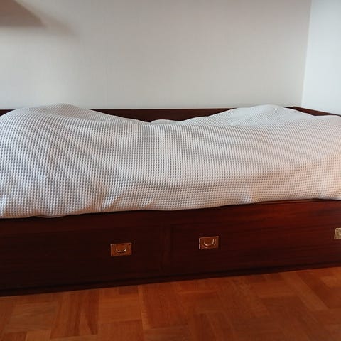 Fin retro skibsbriks fra 1960'erne. Fyrretræ. I god stand, men med brugsspor i form af mindre ridser. Måler ca. 195 x 75 x 66 cm (længde, bredde og højde på ryglæn). Har to gode skuffer til opbevaring.
