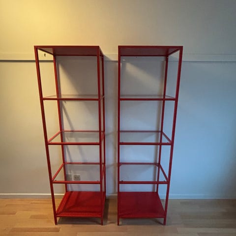 Sælger også to røde enkeltreoler få alle fire reoler for 500