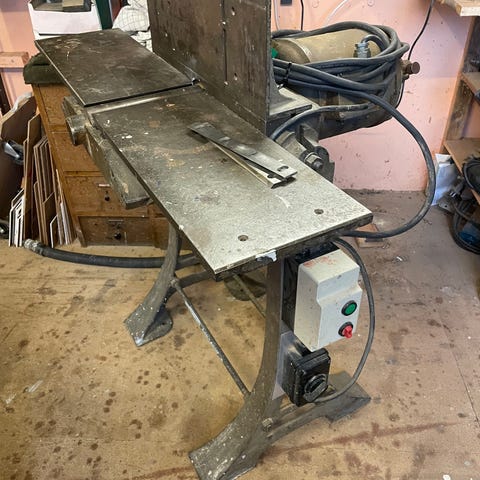 Bund solid støbejerns afretter der kan vippes og køres væk på hjul når den ikke skal bruges. Mener mærket er Factio.