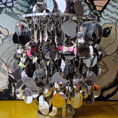 Sælger vores smukke Verner Panton Fun 10DM pendel. Det er den store, klassiske model med fire ringe i krom og skaller af ægte perlemor, som giver et fantastisk, levende lys og en blid lyd, når luften bevæger sig.