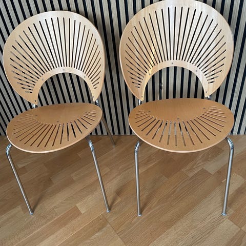 4 stk. helt ens Nanna Ditzel Trinidad stol. Fremstår med minimale brugsspor (se billeder fra kun to af stolene). Model 3298 serie 1297. Lys eg. Kan stables. Sælges KUN samlet. Skal afhentes