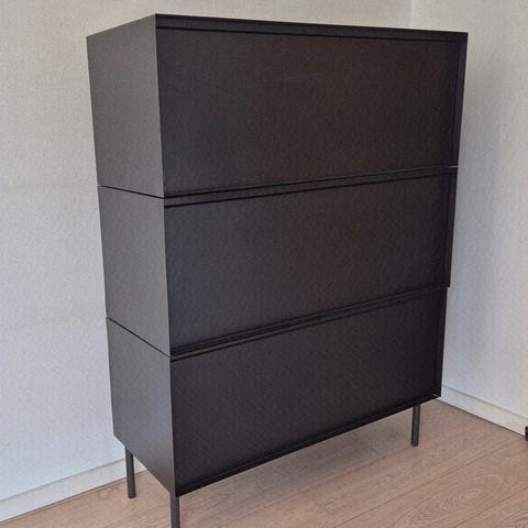 Benene er en lille smule skæve i monteringen, men man lægger ikke mærke til det når den først står, da benen kan rettes ud. De kan skrues af, og så kan den monteres på væggen.