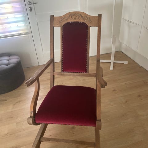 Stolen og skammel i mahogni og fra 19. århundredes møbeldesign, såsom udskårne detaljer i rygstykket, svungne armlæn og drejede ben, som ofte ses i carver- eller empirestil. Begge polstret i lilla uld.