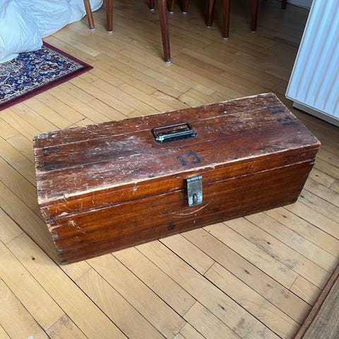 Superfin gammel trækiste. Blåmalet udenpå. Ubehandlet træ indvendigt. Har været fantastisk i mange år til bamser, udklædningstøj og legetøj, men nu må den videre. Mål: 91x46x46