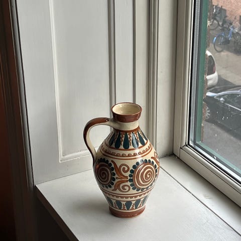 Keramik kande formet som en hane med farverig glasur. Kanden har en hank og en tud til nem hældning. Kan anvendes til servering af væsker. Højde 26 cm