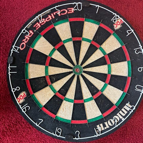 Winmau Blade 6 dartskive med laser-cut stålspidser og carbon fiber forstærkning. Dartskiven har en diameter på 45,7 cm og er designet til professionel brug med en tynd trådteknologi for at minimere dobbelte hits. Serienummer 20713968. Leveres med ophæng