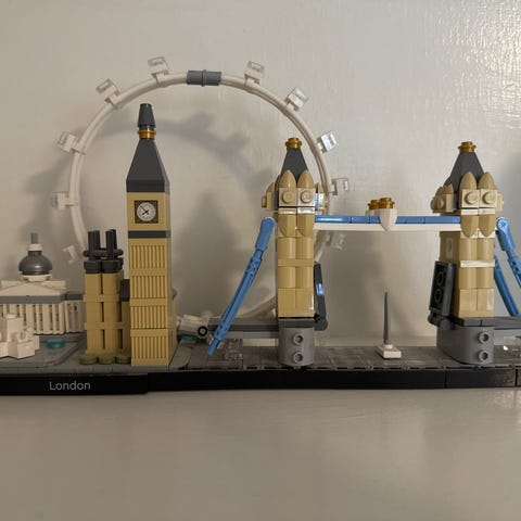 LEGO Architecture London model fra LEGO, der viser kendte vartegn fra London. Modellen indeholder detaljer såsom Big Ben, London Eye og Tower Bridge, lavet i plastmateriale. Velegnet til samlere og dem, der er interesserede i arkitektur og bygningsmodeller.