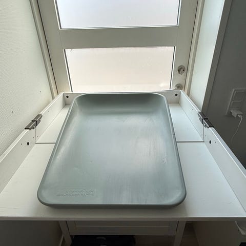 Sundvik puslebord fra IKEA med udtræk, så der kan laves mere plads samt mulighed for at slå det sammen for pladsbesparelse.