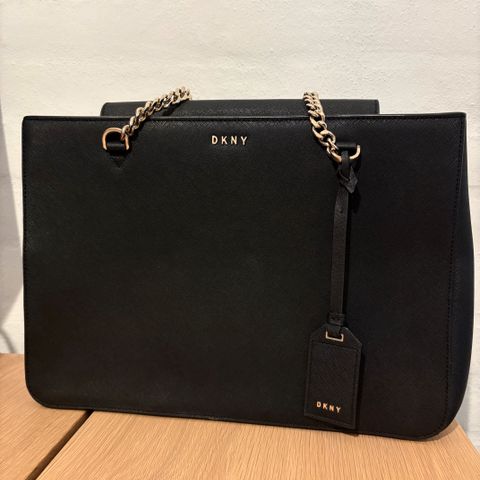 DKNY - taske i farven brun med læder langs kanten samt små guld perler og logo print både foran og bagpå 👜