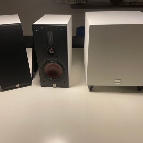 Dali 5.1 sæt bestående af: concept 6, blue 1000c, blue 1000r, concept sub. Fremragende lyd. Sub vejer 21kg. 12 tommer!