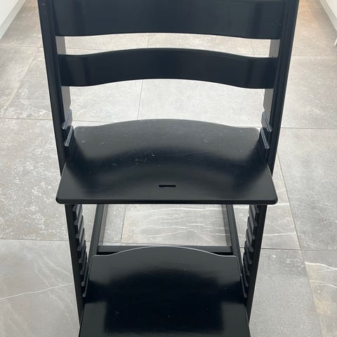 Stokke tripp trapp højstol til børn med sort finish. Højstolen er designet til at give støtte og komfort under måltider og kan justeres i højden for at passe til barnets vækst. Fremstillet af træ med en robust konstruktion.