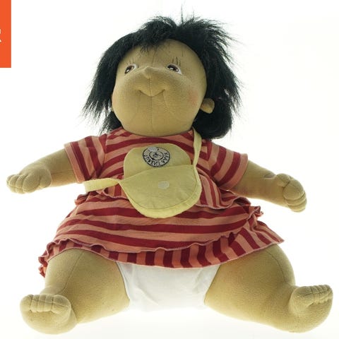 Rubens barn dukke med beige og hvide farver, iført en cremefarvet kjole. Dukken har forskellige mønstre på benene, herunder striber og prikker, og er lavet af stofmateriale.