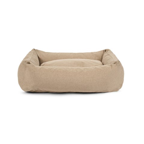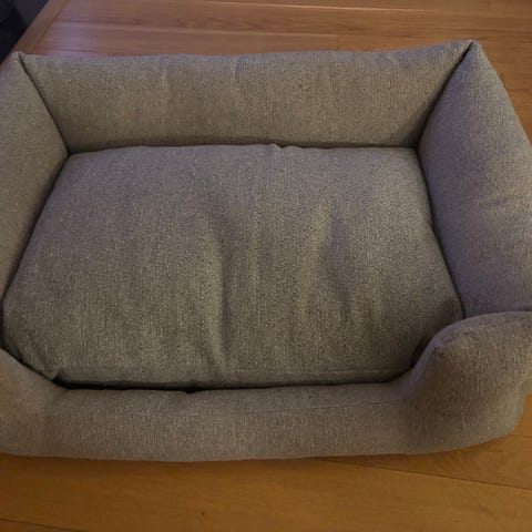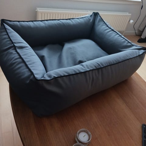 Str. L, 110x 80 udv. mål, 80x60 indv. Sengen har forhøjede kanter for ekstra komfort og støtte. Pude i memeryfoam. Betræk kan tages af og vaskes. Altid været betræk udenpå.
