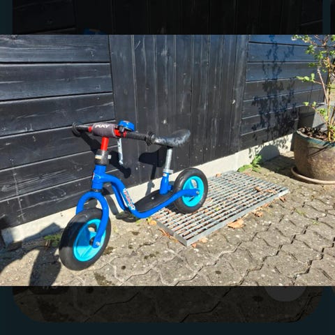 Løbecykel i blå farve med blå hjul. Cyklen har et justerbart sæde og styr, hvilket gør den egnet til børn i forskellige aldre - 3-6 år.