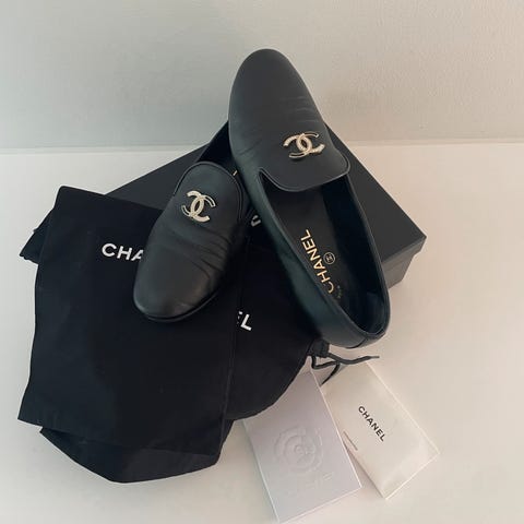 Sorte loafers fra CHANEL i str.39,5/39 (25,5cm.) aldrig brugte æske og dustbag medfølger. Fast pris, ingen bud !