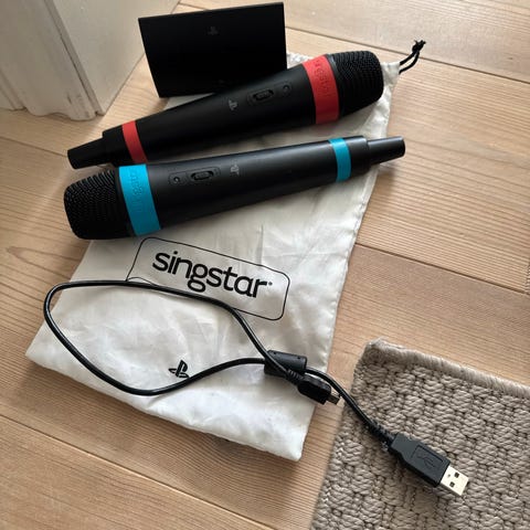 2 mikrofoner fra Playstation til Sing Star eller lignende karaoke spil, med lange kabler til tilslutning via USB.