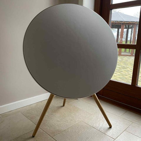 Bang & Olufsen højttaler med rund form og sort stofbetræk. Højttaleren har et hvidt ydre kabinet og træben. Designet til brug i hjemmet til lydafspilning.