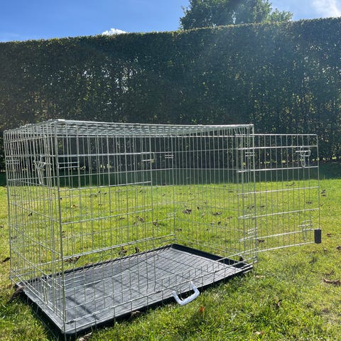 Metal hundebur/kravlegård med sort bund. Buret har en låsbar dør og er designet til at give et sikkert område til hunde, 125cm x 78cm x 90cm, kun samlet ej brugt, nypris 1500,-.