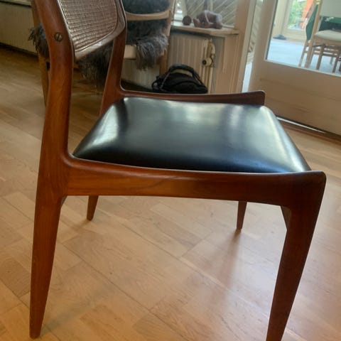 Som nye i teak og med koksgrå/petroleum polster. Den er lavet til at kunne bruges udendørs og indendørs. Vi har haft dem i 2-3 år, og de har aldrig været ude. Ikke ryger hjem. Denne farvekombination er sjælden.