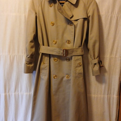 Vintage Burberry trenchcoat i den klassiske beige farve. Nok størrelse S/36. Frakken er pæn og generelt velholdt, men der er flere brugsspor. Der er slid på alle spænder, der er noget fedtplet under den venstre lomme og nogle andre små pletter rundt omkring (se billeder). Måske forsvinder de ved rens. Prisen er sat derefter. Kan sendes.