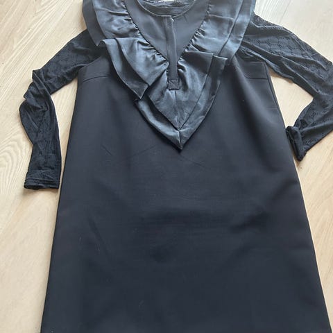 Kongeblå festkjole med fin detalje foran brystet. Når ned midt på knæet på 168 cm høj kvinde