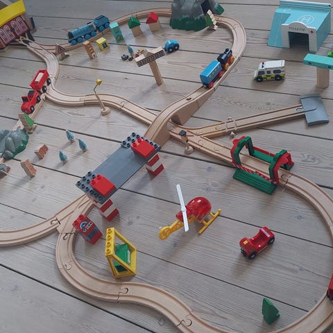 Stor BRIO togbane med Brio vognsæt og Thomas Tog vognsæt. Sættet består ellers af: Brio Togstation i Træ, Rød Brio Bro, Stor rund Brio dreje skiftespor, Brio Bumskinne, Brio træer, dyr og mennesker, Stationsbygning i træ med bumme, Retro færge i træ, Bondehus som har huller til skinner, Trafik lys med lys som skifter samt div andre ting. Der er forskellige skinner, nye og ældre: buede, lige og sporskifte skinner i træ. Alt på billederne medfølger, og er pakket i en pose. Sættet kan sammensættes til mange forskellige baner. Det er primært træ og plastik. Egnet til børn til leg og udvikling af motoriske færdigheder.