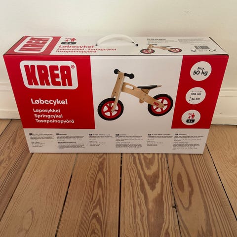 Krea Løbecykel i træ. Designet til børn fra 2 år og opefter. Cyklen har en let konstruktion og er beregnet til at hjælpe børn med at udvikle balance og koordination.