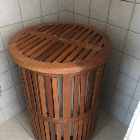 Trævaskekurv med en aftagelig stofindsats. Designet med en låge, der kan åbnes opad, og med et gittermønster på siderne for ventilation. Velegnet til opbevaring af vasketøj.