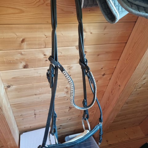 Hestetrense i pink farve med dekorative perler på næsebåndet. Fremstillet af slidstærkt materiale og designet til brug på heste.