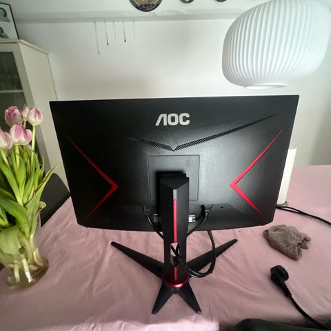 AOC 24" skærm med buet design. Skærmen har en sort og rød farve, og er monteret på et stativ med fire ben. Velegnet til brug som computerskærm.