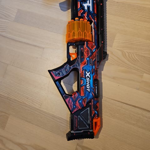 Zuru X-Shot legetøjsgevær med tromlemagasin i blå, hvid, orange og sort plastmateriale. Legetøjsgeværet inkluderer to ekstra dele og er designet til børn.