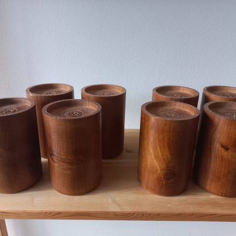 4 stk runde Møbelforhøjere i træ. Kun prøvet under lænestol en enkelt dag. Desværre for høje.