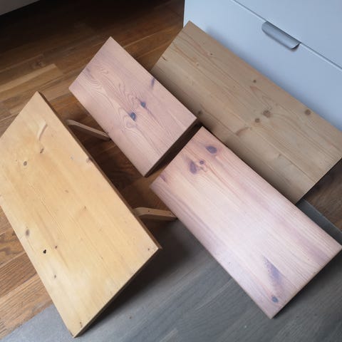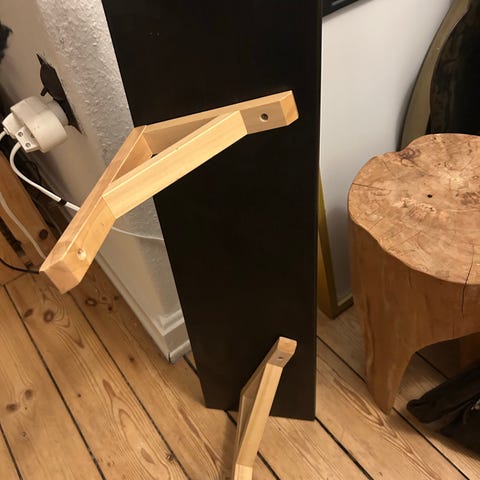 Design: som sortbejdset træ. Ingen synlige brugsspor. Sælges som sæt ink. hyldeknægte og skruer. Giv et bud!