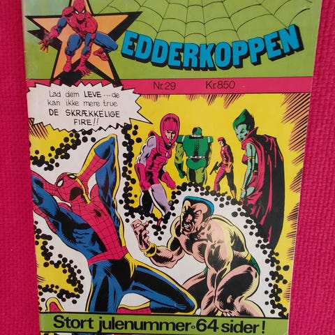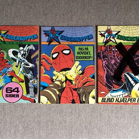 Samling Edderkoppen-blade, (5 stk.), der er nr. 1973: nr. 2, 3, 1992: nr. 93, Edderkoppen Klassiker nr. 6, Edderkoppen sommer special 1990. Bladene har brugsspor, men er generelt i rimelig stand. Se også fotos for stand. Samlet pris 250 kr., sender gerne.