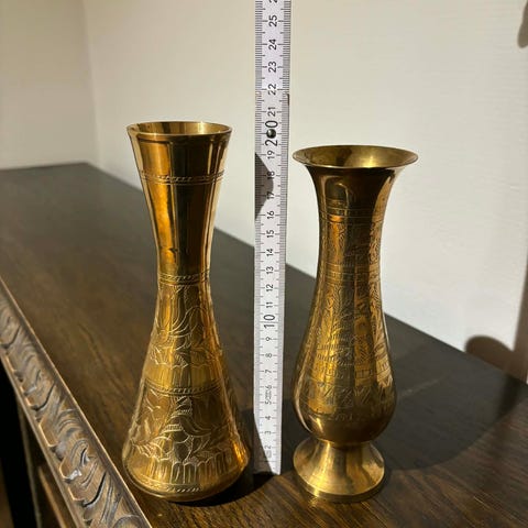 Messing vaser, Danpresent, 3 messing vaser. 6 - 15 og 17,5 cm høje og 4,3 - 4,4 og 5,3 cm i dia. Samlet pris ialt.