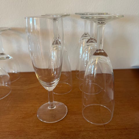 Gamle glas 15 cm høje. Sættet indeholder 6 stk. 2 af den har billesmå bobler/fejl, se foto. 50 kr stk. Sælges samlet.
