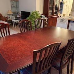 Spisebord i mahogni med seks tilhørende seks stole. Bordet har en finish med et mønstret bordplade og matchende stole og flot vitrineskab. sælges samlet kr. 2000