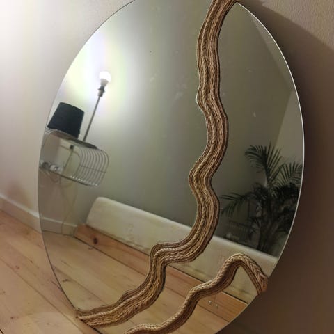 Spejlet har et dekorativt mønster på rammen, der tilføjer et unikt visuelt element. Velegnet til vægophæng i forskellige rum.