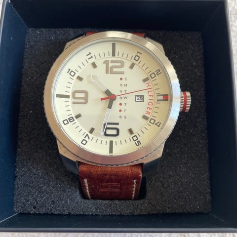 Tommy Hilfiger herreur med sort urskive og sort læderrem. Uret er designet til mænd og har en klassisk stil.brugt få gange Diameter 44 Sender gerne dog ikke som Fiks og færdig