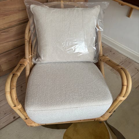 Smuk lænestol også kendt som Teddy produceret i Rattan, dansk design ikon - der medfølger naturfarvet m. hynde i uld i farven Old Mustard (hynde aftagelig) - stolen kan bruges med eller uden hynde.