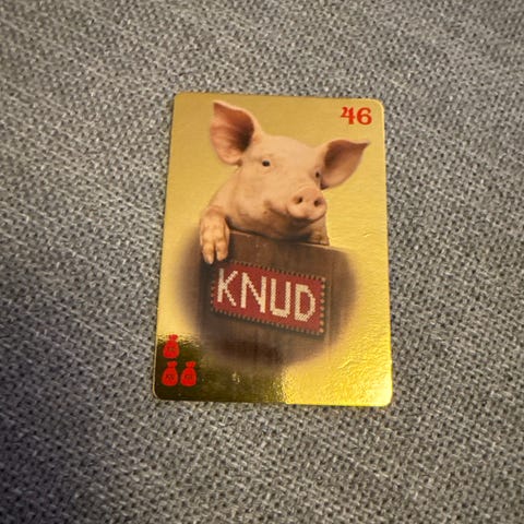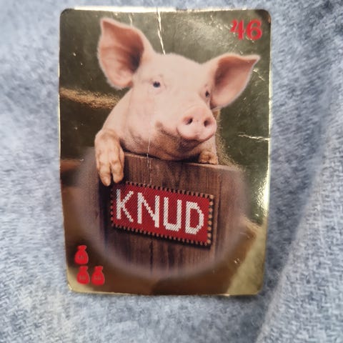 Knud Kortspil med billede af en gris på forsiden. Spillet indeholder kort til underholdning og spil.