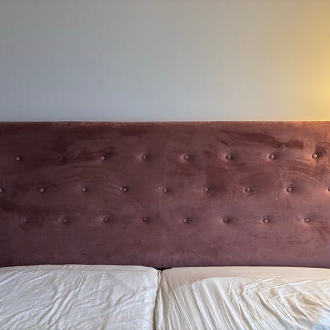 Sengegavl, trenset blå velour, helt ny og uåbnet. Købt november 2025 fra Drømmeland. Mørkeblå farve som blå seng på foto. Trenset gavl som beige seng på foto. Nypris 6000 kr