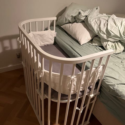 1x Bedside crib fra Babybay - Boxspring Comfort (høj og bred) inkl. sidestykke - Lakeret træ