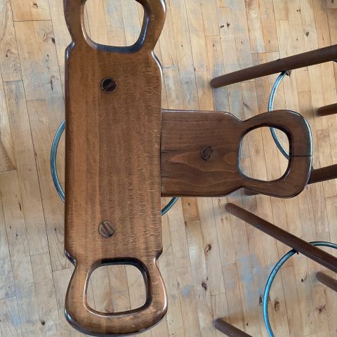 Barstol med rund sæde og ryglæn betrukket med brun læder. Stolen har siddehøjde på 82cm og en fodstøtte i metal. Stellet er sort metal med pedaler som en del af designet. Velegnet til brug ved bar- eller køkkenbord.