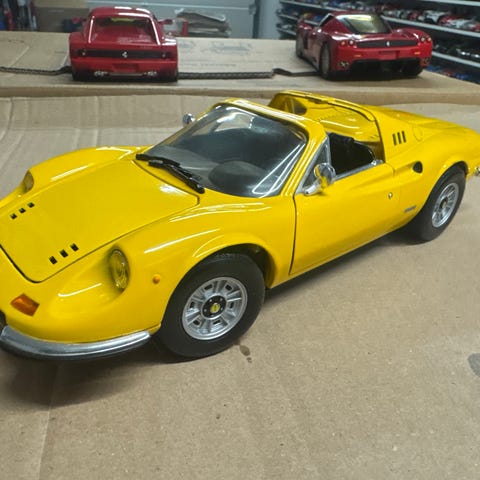 Ferrari F355 Spider modelbil i rød farve med beige interiør. Detaljeret miniaturebil med åbningsbare døre og motorhjelm. Velegnet til samling eller udstilling.