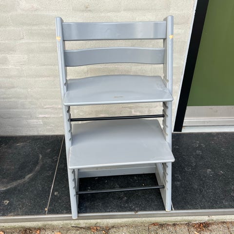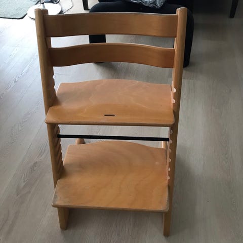 Stokke højstol i træmateriale. Højstolen har justerbare trin og sæde, hvilket gør den egnet til børn i forskellige aldre. Designet til at give støtte og komfort under måltider og andre aktiviteter.