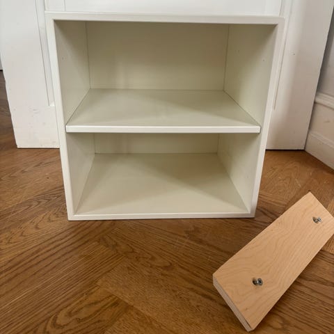 Jeg har også 3 bogkasser i fyrretræ fra trævarernes, som passer til en ABC-reol. De er 75x75x30 cm og har 6 rum. To af dem er hvidmalet og den sidste er ubehandlet træ.