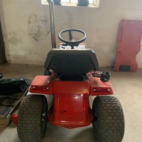 Traktoren er defekt, da den drypper med olie når den køre, og ophænget til klipperen under traktoren er knækket
