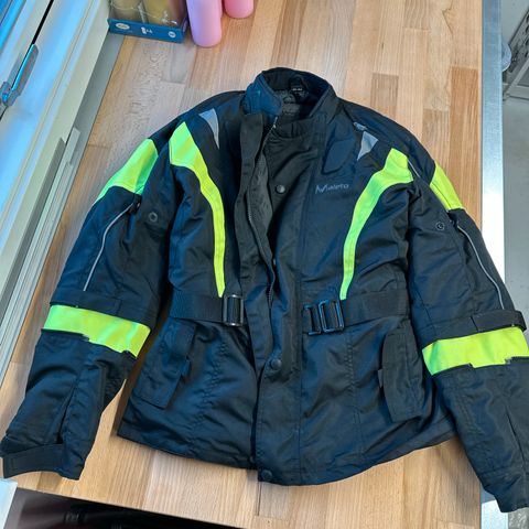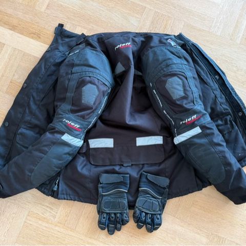 MC jakke og handsker i sort og rød farve. Jakken har flere lommer og justerbare stropper ved taljen. Indvendigt er jakken foret med netstof for bedre ventilation. Inderfor har vi ikke længere. Str. 128. Passer til barn på 6-10 år